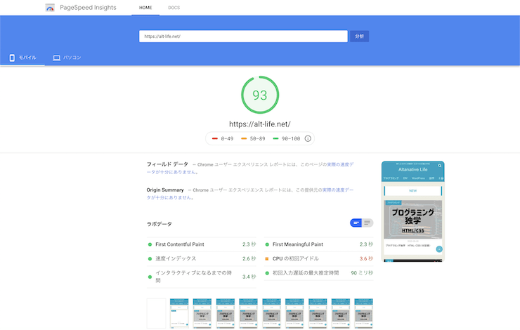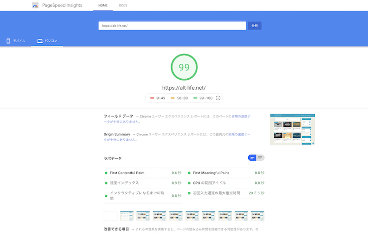 2020年5月6日時点のPageSpeed Insights測定結果ですが、特別な対策・プラグインの導入などをせずとも、テーマを変更しただけで以下のような結果となりました。正直、もうこれで十分です。